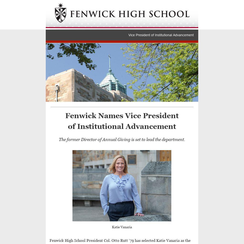 Fenwick High School President Col. Otto Rutt ‘79 has selected Katie Vanaria as the school’s next Vice President of Institutional Advancement, effective immediately. She has served as interim director of the department since August after three years working in the advancement team.