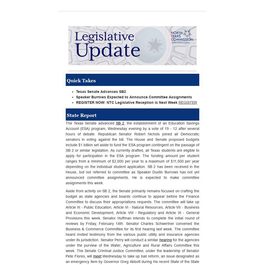 The Texas Senate advanced SB 2, the establishment of an Education Savings Account (ESA) program, Wednesday evening by a vote of 19 - 12 after several hours of debate. Republican Senator Robert Nichols joined all Democratic senators in voting against the bill. The House and Senate proposed budgets include $1 billion set aside to fund the ESA program contingent on the passage of SB 2 or similar legislation. As currently drafted, all Texas students are eligible to apply for participation in the ESA program. The funding amount per student ranges from a minimum of $2,000 per year to a maximum of $11,500 per year depending on the individual student application. SB 2 has been received in the House, but not referred to committee as Speaker Dustin Burrows has not yet announced committee assignments. He is expected to make committee assignments this week.