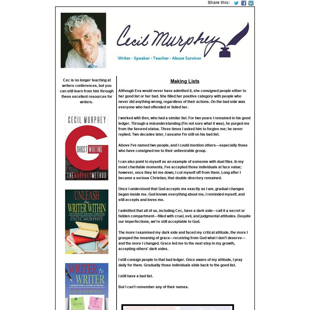Cec's Links: Website, Twitter, Blog for Writers, Blog for Male Survivors, Facebook (Author/Speaker), Facebook (Cec and Me), Murphey's Maxims Pinterest, Amazon Author Page