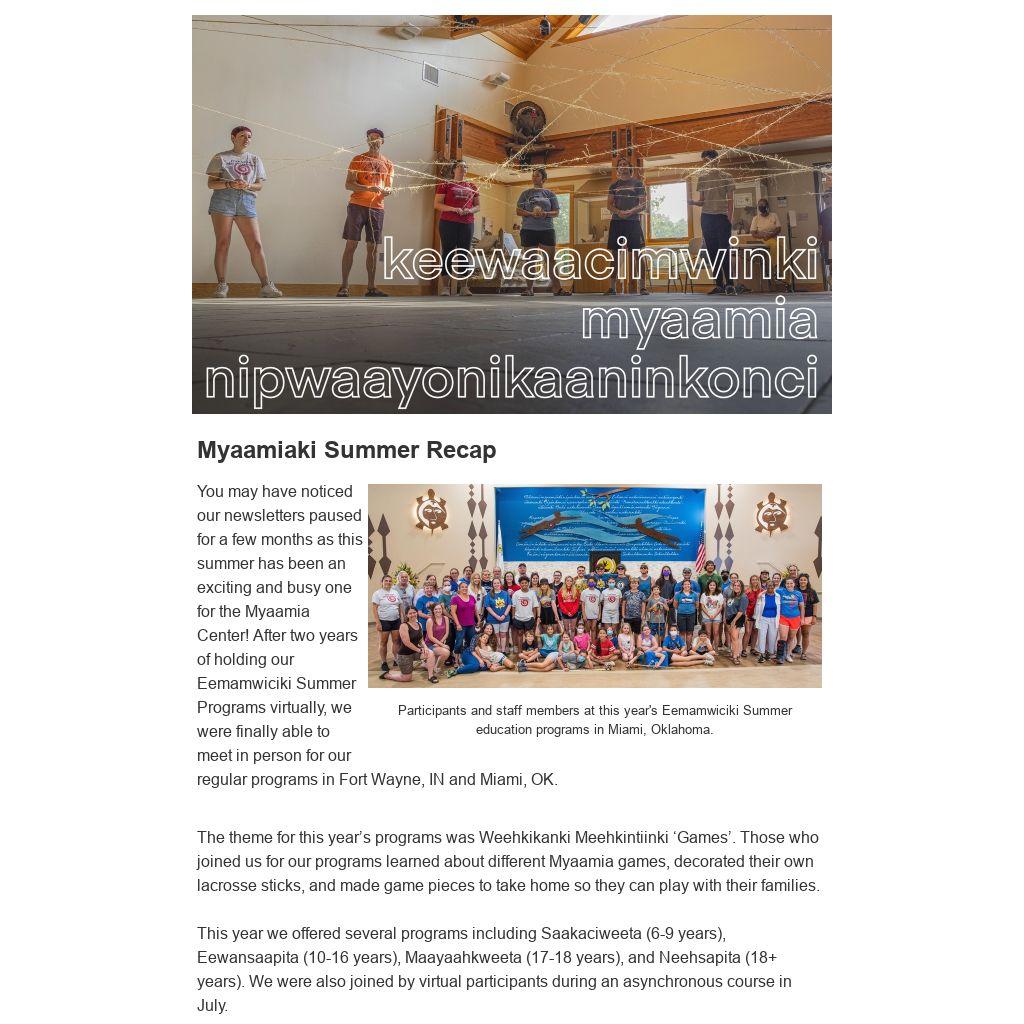 You may have noticed our newsletters paused for a few months as this summer has been an exciting and busy one for the Myaamia Center! After two years of holding our Eemamwiciki Summer Programs virtually, we were finally able to meet in person for our regular programs in Fort Wayne, IN and Miami, OK.