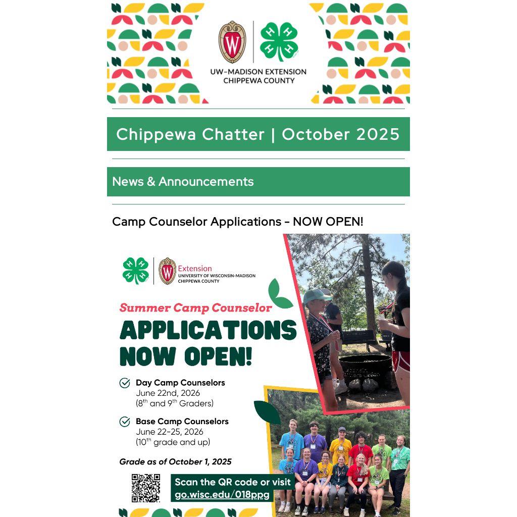 For a detailed list of upcoming county events, visit our Chippewa County 4-H Youth Development website at go.wisc.edu/chippewa4hevents. There, you can find all the details on upcoming events, important deadline reminders, and much more.