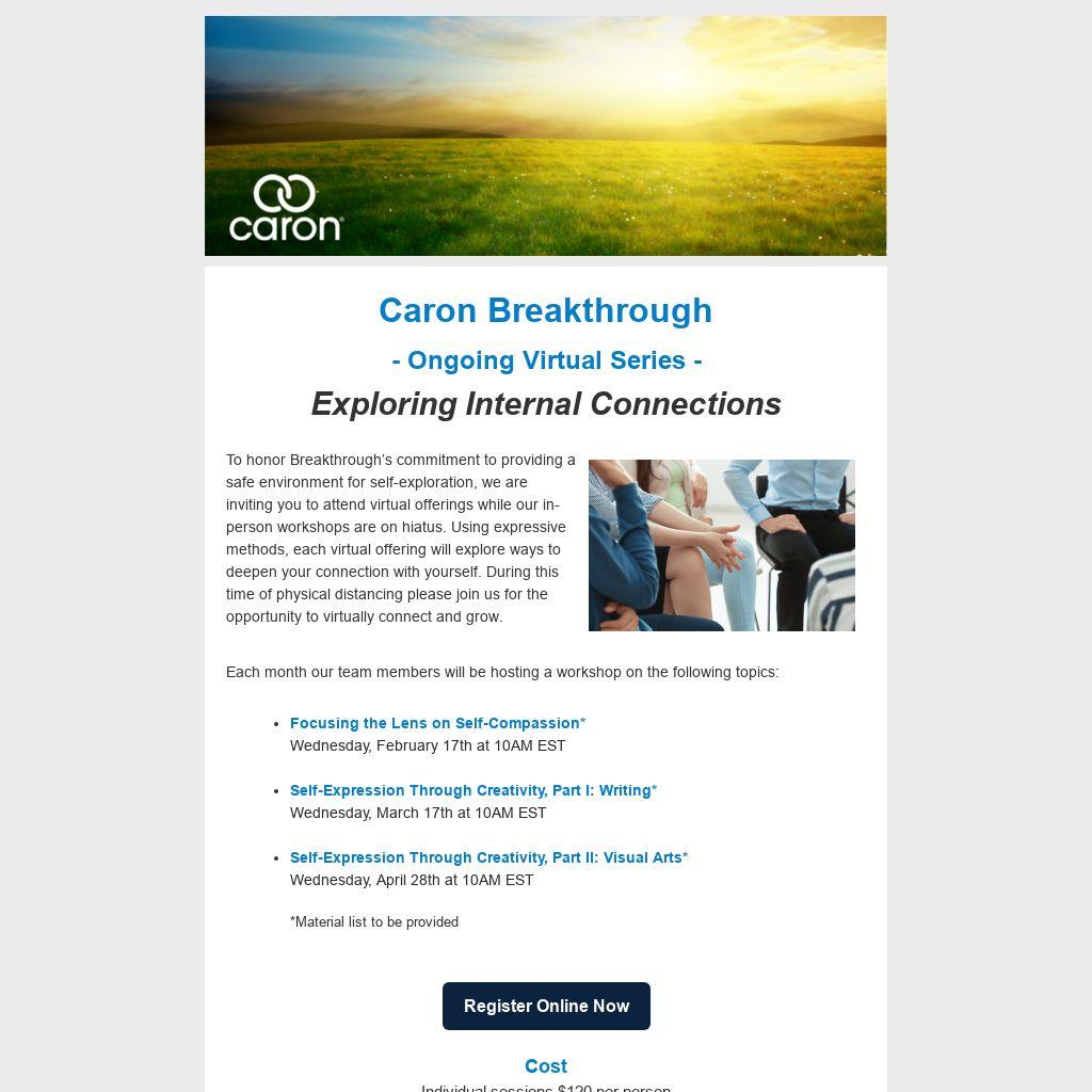 To honor Breakthrough’s commitment to providing a safe environment for self-exploration, we are inviting you to attend virtual offerings while our in-person workshops are on hiatus. Using expressive methods, each virtual offering will explore ways to deepen your connection with yourself. During this time of physical distancing please join us for the opportunity to virtually connect and grow.