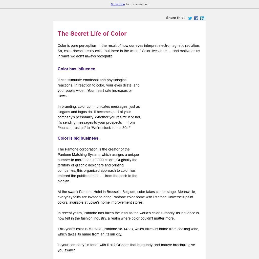 In branding, color communicates messages, just as slogans and logos do. It becomes part of your company's personality. Whether you realize it or not, it's sending messages to your prospects — from "You can trust us" to "We're stuck in the '80s."