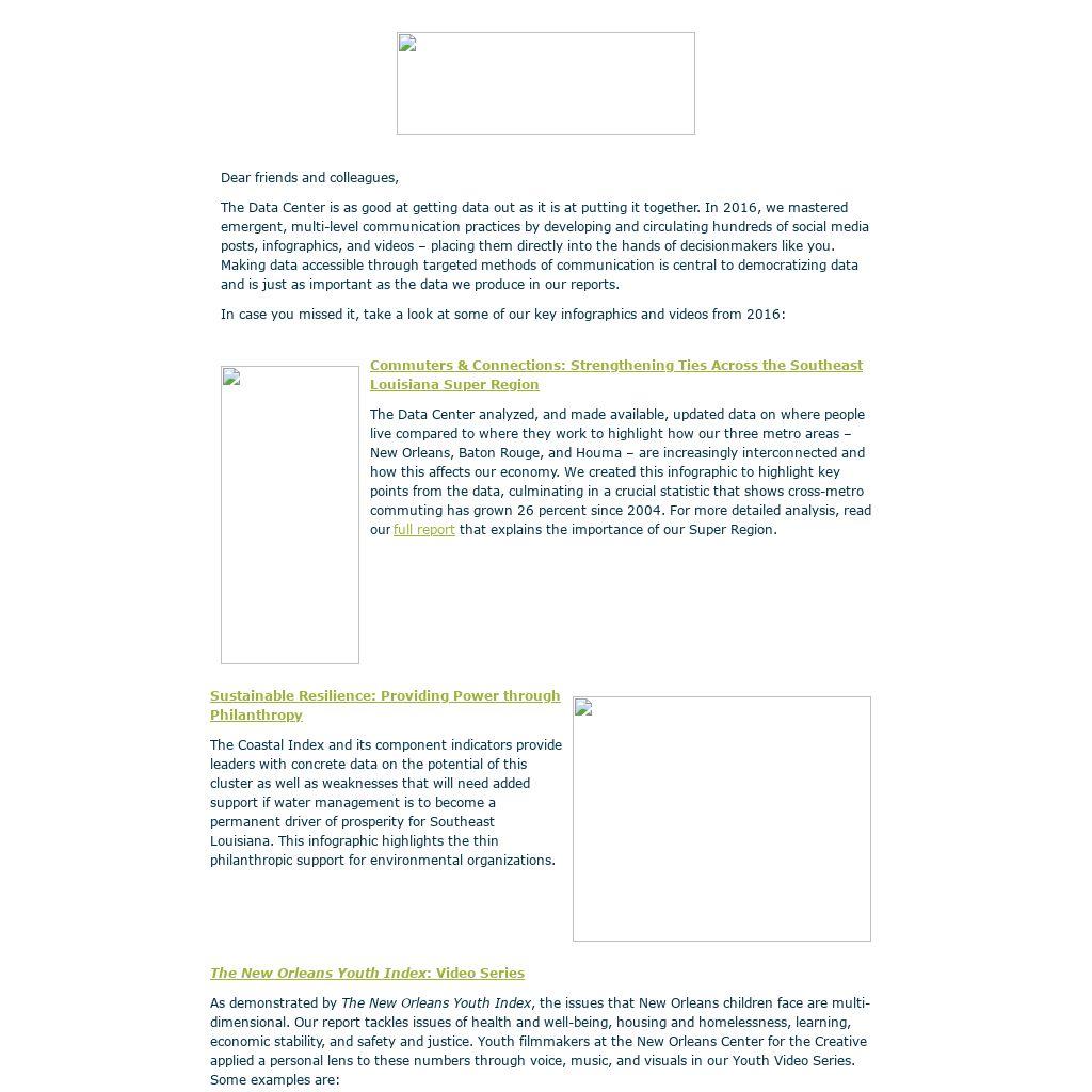 Looking forward to 2017, we are developing initiatives of critical importance to our region as we lead up to the city’s Tricentennial Year in 2018. The Data Center will delve deep into how Southeast Louisiana can capitalize on economic opportunity by focusing on the emerging water management cluster and confronting systemic issues of race and inequity.