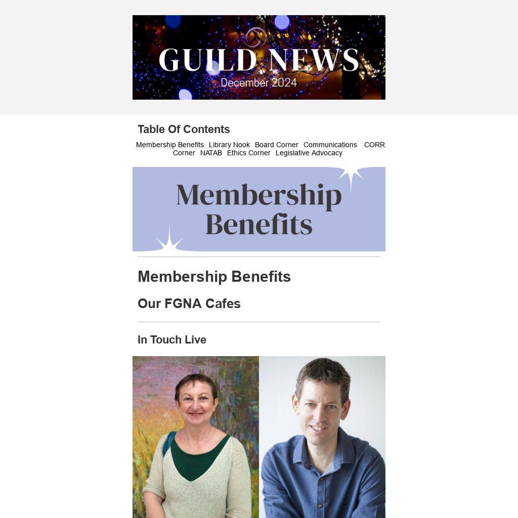 In November, the FGNA Board of Directors met over 4 days for the Annual Face to Face (F2F). In keeping with one of its pillars for the Guild to remain financially sustainable, the Board met via Zoom this year. At the F2F the Board received reports from the many different FGNA committees, some that work in collaboration with Virtual and others that are manned solely by members who volunteer their time and energy to keep the Guild functioning and improving. The committees included the Certification/Graduation, Communications, Conference, CORR, Elections , Government Relations, IFF, Membership, NATAB, Nominating, Policy, Service Marks, and Website. The reports included the committee’s goals for the year, how they accomplished them, results of membership surveys, Committee Playbooks, and what the committee’s goals and recommendations are for next year. The Board reviewed budgets, policy and voted on changes that will assist to make our Guild more efficient and effective in serving its membership and the public.