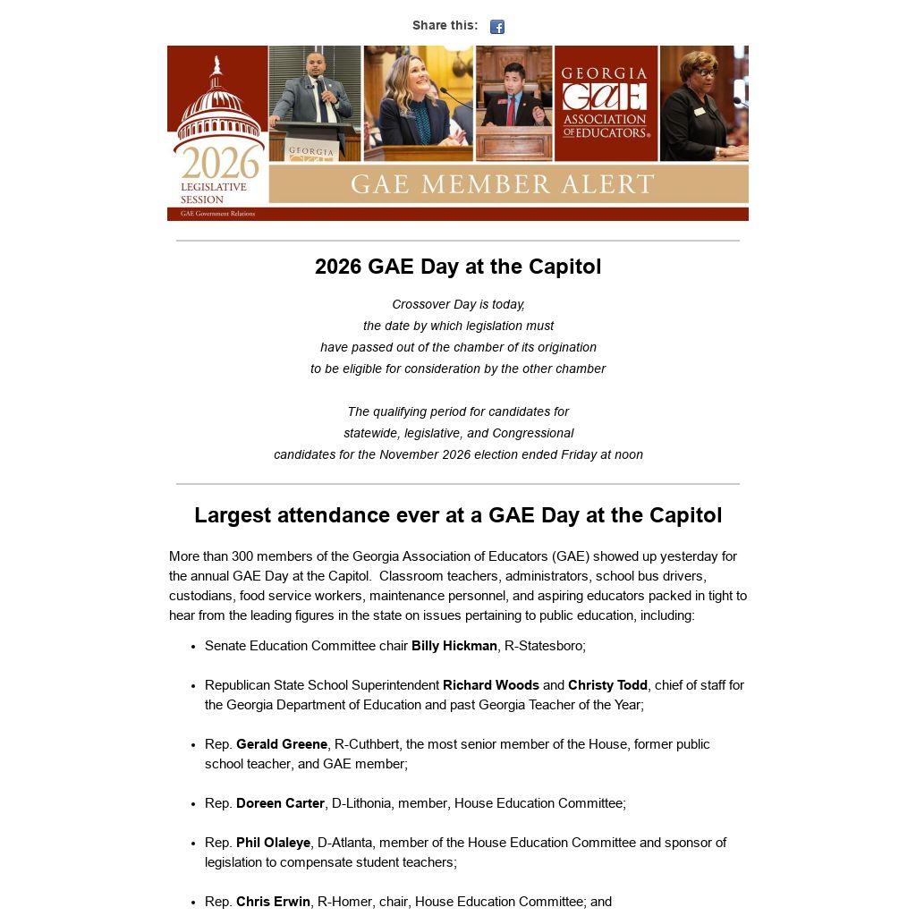 - Rep. Gerald Greene, R-Cuthbert, the most senior member of the House, former public school teacher, and GAE member;