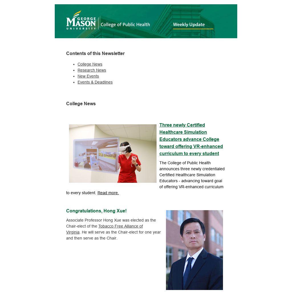 How Congressional Directed Spending for research works: You may have heard about “Congressional Directed Spending,” or earmarks, which have supported several important initiatives in CPH. Briefly, these are funds that are appropriated by Congress for specific activities at Mason. Mason is fortunate to have received $5 million - $7 million in such earmarks in the past few years because they are highly competitive and sought after by many Virginia stakeholders. The process begins with ideas that CPH and other colleges share with Mason’s federal government relations team. The team then presents the ideas to Congressional staff, which can be House or Senate staff depending on the Congressional budget rules at play. With any luck some of the projects become part of the spending bill that the appropriations committee drafts. The last step is for that bill to be voted on by the full Congress, whereupon it becomes law. After receiving their earmarks and getting their projects underway, several Mason investigators have subsequently pursued follow-on research or training grants through more traditional channels. Different funding sources warrant different approaches and ideas, and earmarks are no different. If you have an idea for an initiative, please reach out and we can talk about whether and how it might fit this mechanism.