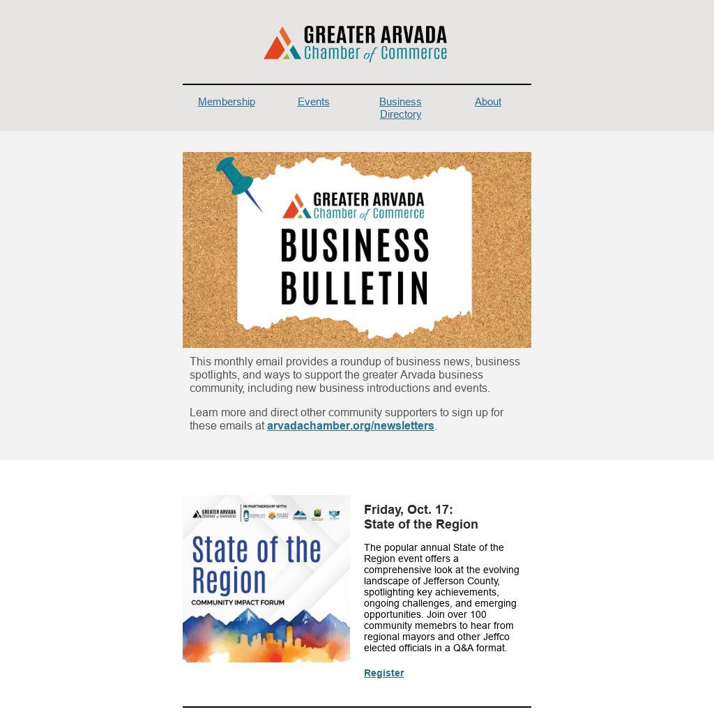 This monthly email provides a roundup of business news, business spotlights, and ways to support the greater Arvada business community, including new business introductions and events.