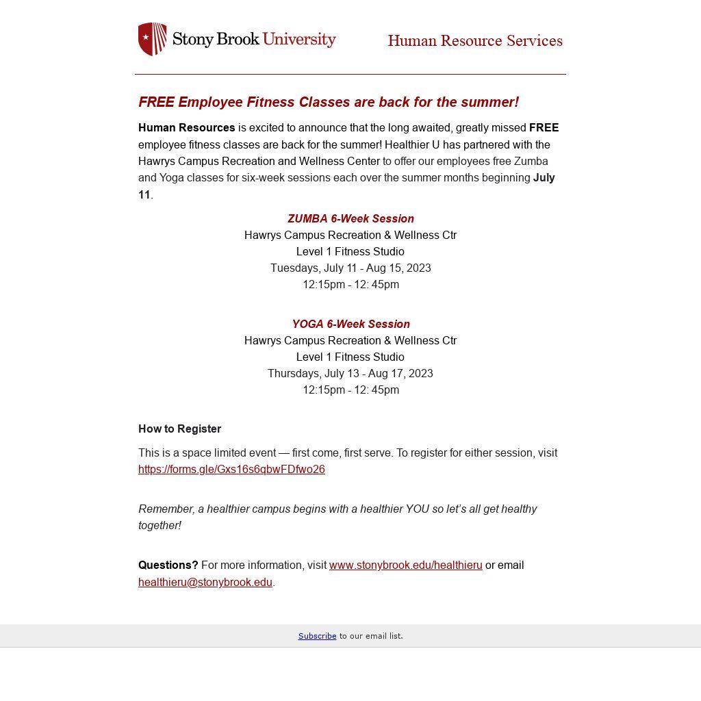 Human Resources is excited to announce that the long awaited, greatly missed FREE employee fitness classes are back for the summer! Healthier U has partnered with the Hawrys Campus Recreation and Wellness Center to offer our employees free Zumba and Yoga classes for six-week sessions each over the summer months beginning July 11.
