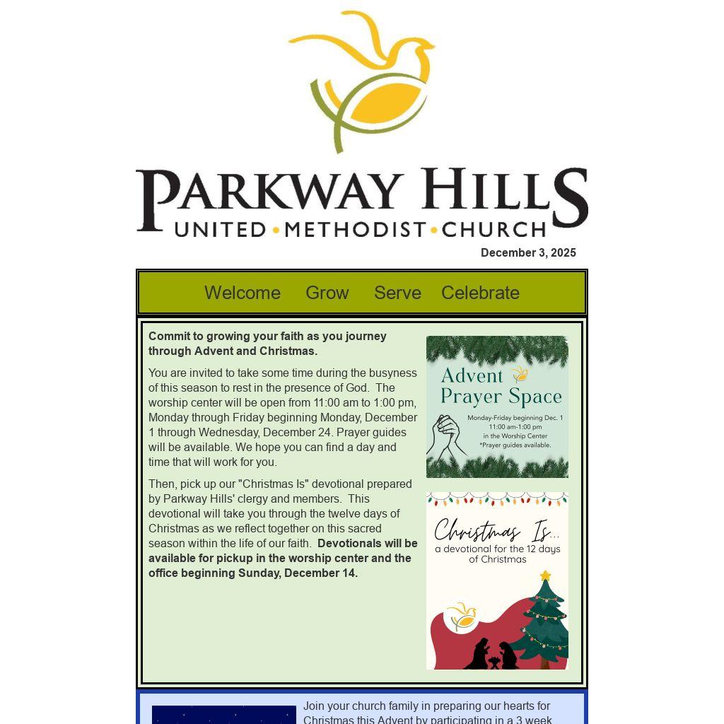 Then, pick up our "Christmas Is" devotional prepared by Parkway Hills' clergy and members. This devotional will take you through the twelve days of Christmas as we reflect together on this sacred season within the life of our faith. Devotionals will be available for pickup in the worship center and the office beginning Sunday, December 14.