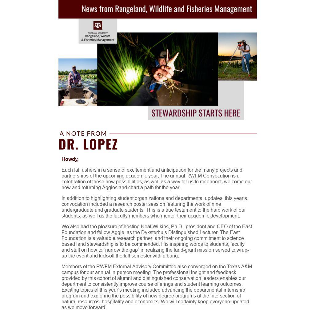 Members of the RWFM External Advisory Committee also converged on the Texas A&M campus for our annual in-person meeting. The professional insight and feedback provided by this cohort of alumni and distinguished conservation leaders enables our department to consistently improve course offerings and student learning outcomes. Exciting topics of this year’s meeting included advancing the departmental internship program and exploring the possibility of new degree programs at the intersection of natural resources, hospitality and economics. We will certainly keep everyone updated as we move forward.