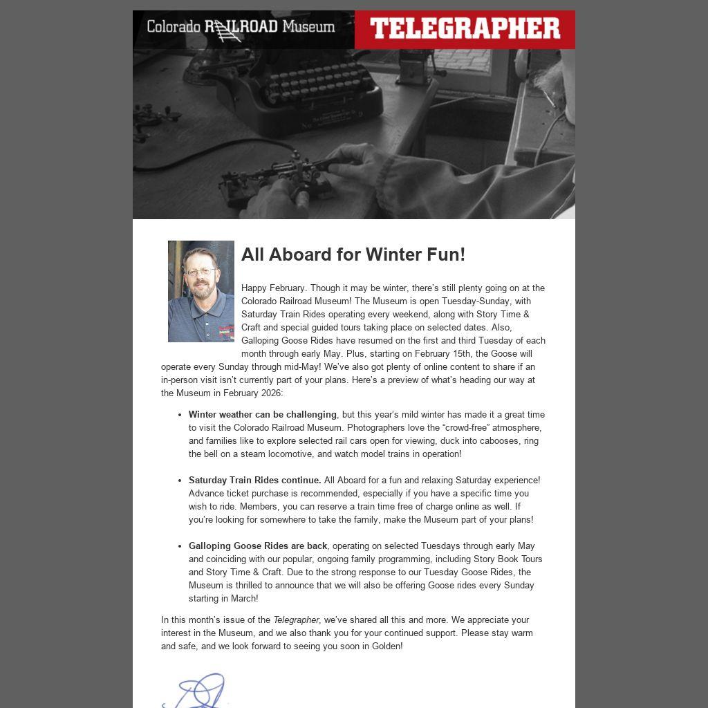 In this month’s issue of the Telegrapher, we’ve shared all this and more. We appreciate your interest in the Museum, and we also thank you for your continued support. Please stay warm and safe, and we look forward to seeing you soon in Golden!