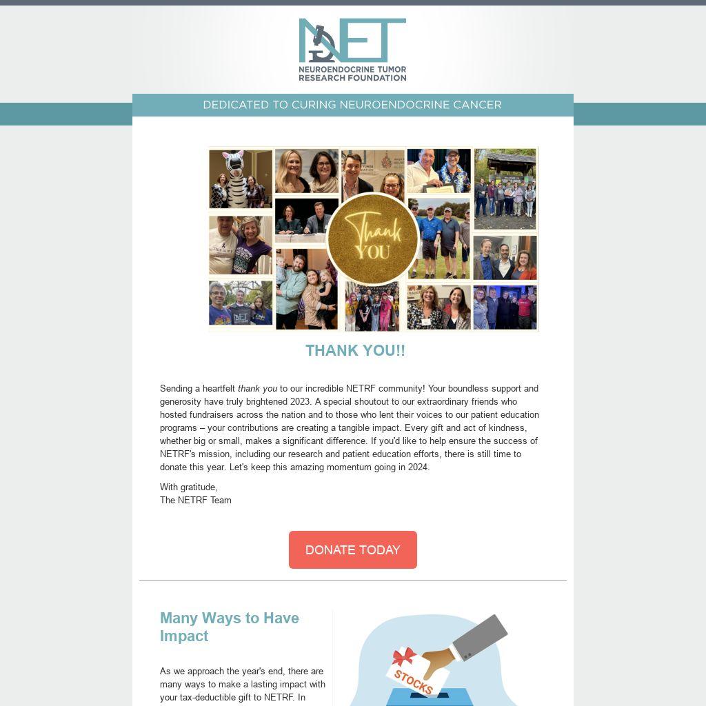 Sending a heartfelt thank you to our incredible NETRF community! Your boundless support and generosity have truly brightened 2023. A special shoutout to our extraordinary friends who hosted fundraisers across the nation and to those who lent their voices to our patient education programs â your contributions are creating a tangible impact. Every gift and act of kindness, whether big or small, makes a significant difference. If you'd like to help ensure the success of NETRF's mission, including our research and patient education efforts, there is still time to donate this year. Let's keep this amazing momentum going in 2024.