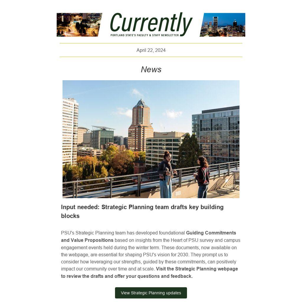 PSU's Strategic Planning team has developed foundational Guiding Commitments and Value Propositions based on insights from the Heart of PSU survey and campus engagement events held during the winter term. These documents, now available on the webpage, are essential for shaping PSU's vision for 2030. They prompt us to consider how leveraging our strengths, guided by these commitments, can positively impact our community over time and at scale. Visit the Strategic Planning webpage to review the drafts and offer your questions and feedback.