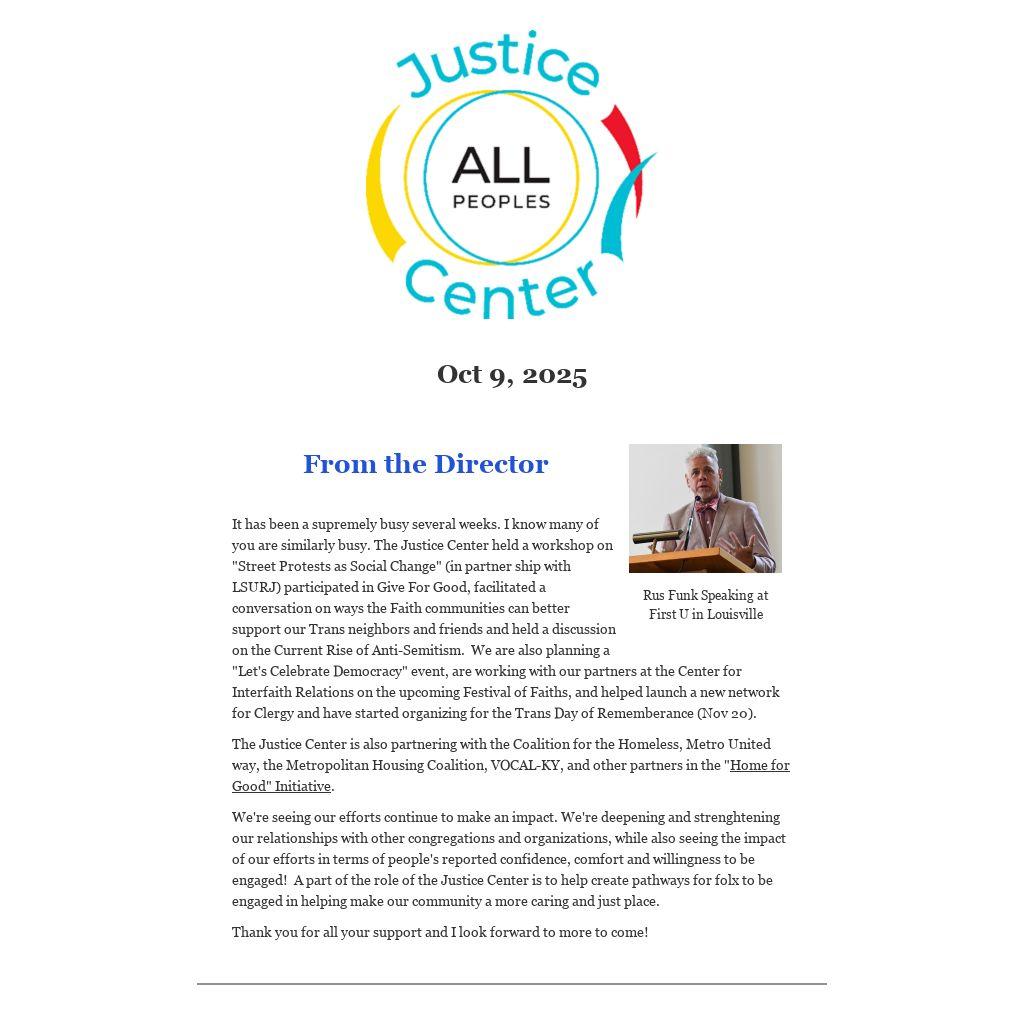 This is the first year that the Justice Center particpated in Give for Good. We set an initial goal to raise $5000. As we continued our planning, it became clear that we would surpass that goal, and so we raised the goal to $7000. THANKS to many of you we surpassed that goal and raised a total of $7500 from 65 individual donors. I can't tell you how much I appreciate your support to our work and our mission!