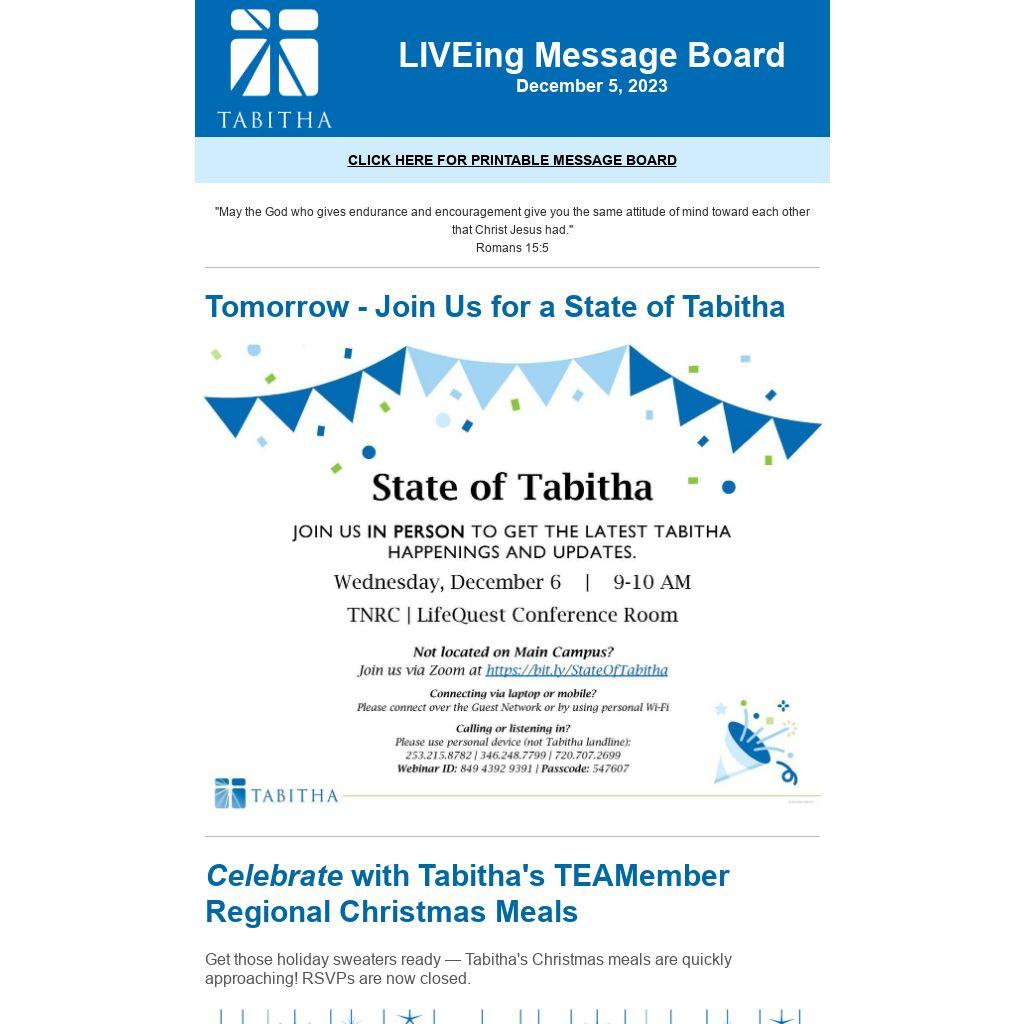 Questions about the LIVEing Message Board? Have an idea for a new article? Submissions must be received by noon each Thursday to be included in the next week's edition. Contact us at Marketing@Tabitha.org.