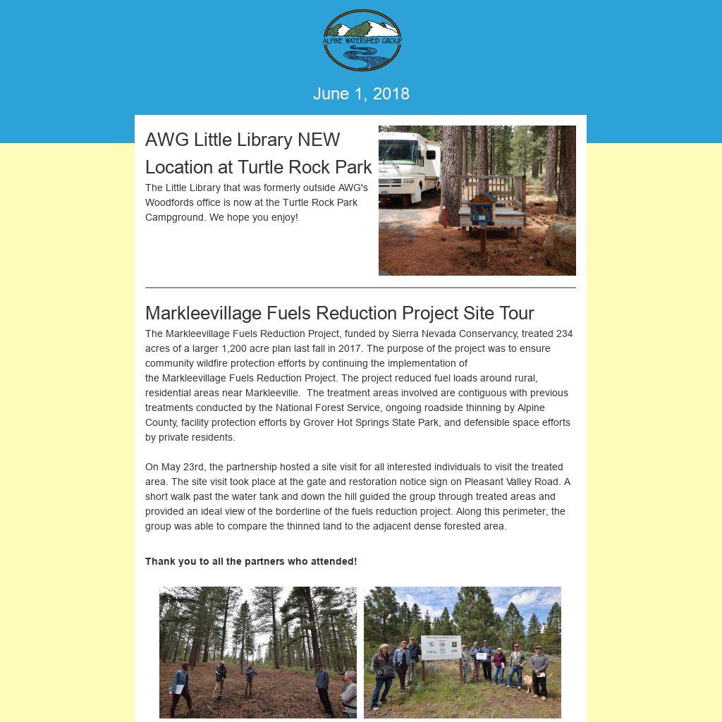 The Markleevillage Fuels Reduction Project, funded by Sierra Nevada Conservancy, treated 234 acres of a larger 1,200 acre plan last fall in 2017. The purpose of the project was to ensure community wildfire protection efforts by continuing the implementation of the Markleevillage Fuels Reduction Project. The project reduced fuel loads around rural, residential areas near Markleeville. The treatment areas involved are contiguous with previous treatments conducted by the National Forest Service, ongoing roadside thinning by Alpine County, facility protection efforts by Grover Hot Springs State Park, and defensible space efforts by private residents.