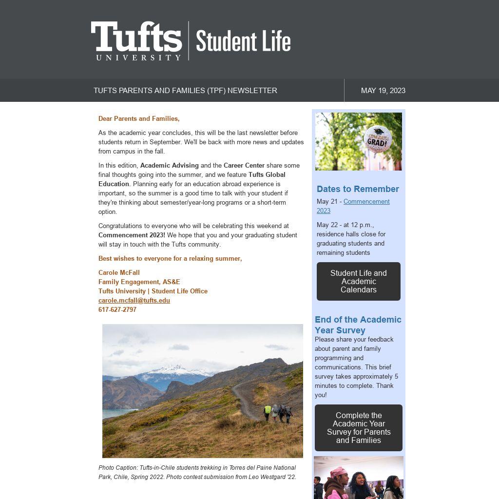 Congratulations to everyone who will be celebrating this weekend at Commencement 2023! We hope that you and your graduating student will stay in touch with the Tufts community.