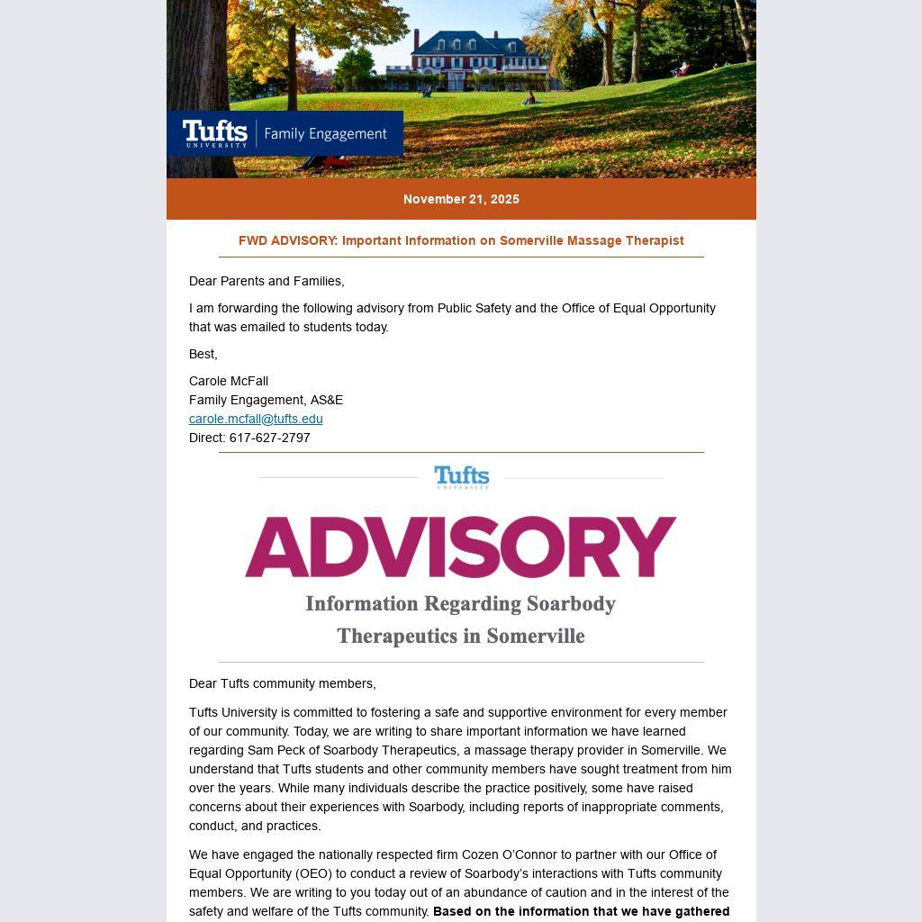 Tufts University is committed to fostering a safe and supportive environment for every member of our community. Today, we are writing to share important information we have learned regarding Sam Peck of Soarbody Therapeutics, a massage therapy provider in Somerville. We understand that Tufts students and other community members have sought treatment from him over the years. While many individuals describe the practice positively, some have raised concerns about their experiences with Soarbody, including reports of inappropriate comments, conduct, and practices.