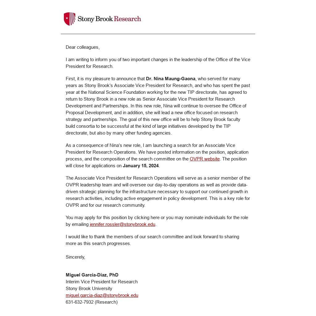As a consequence of Nina’s new role, I am launching a search for an Associate Vice President for Research Operations. We have posted information on the position, application process, and the composition of the search committee on the OVPR website. The position will close for applications on January 15, 2024.