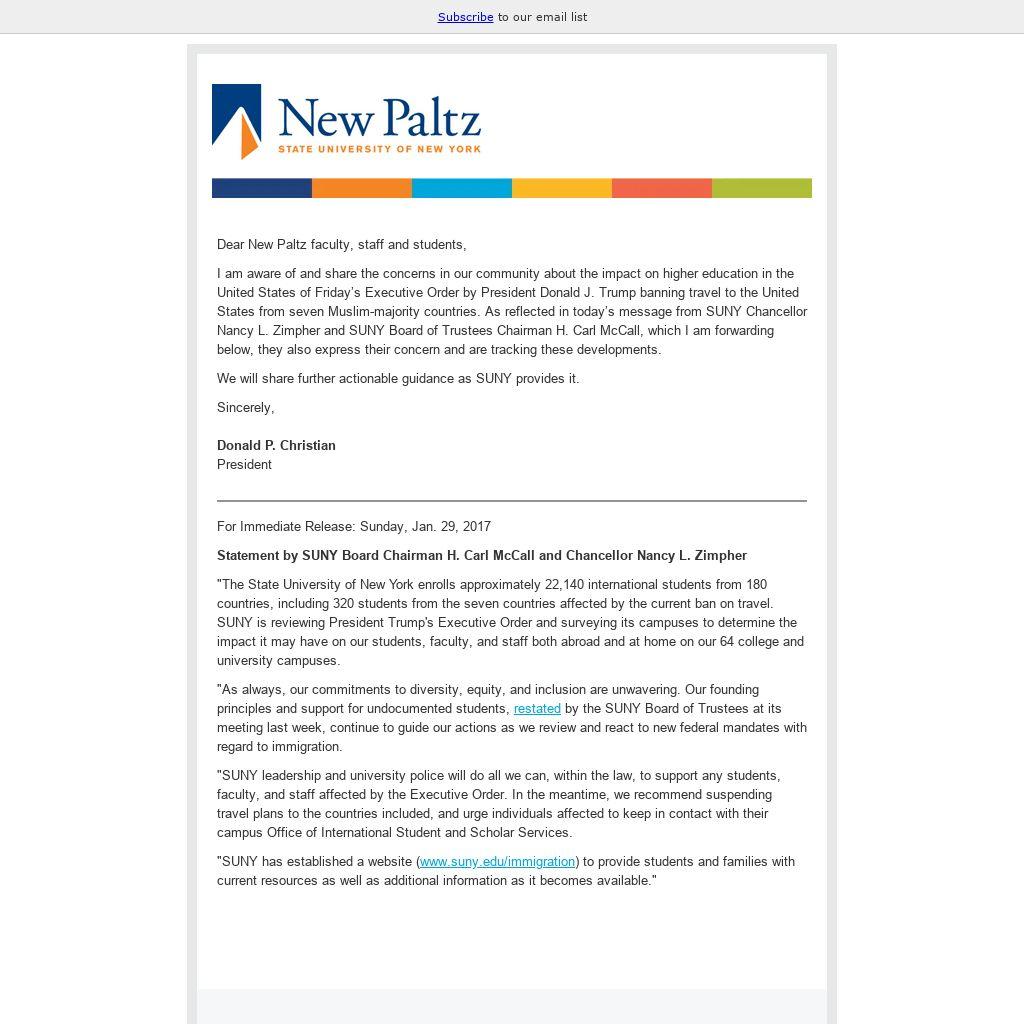"SUNY leadership and university police will do all we can, within the law, to support any students, faculty, and staff affected by the Executive Order. In the meantime, we recommend suspending travel plans to the countries included, and urge individuals affected to keep in contact with their campus Office of International Student and Scholar Services.