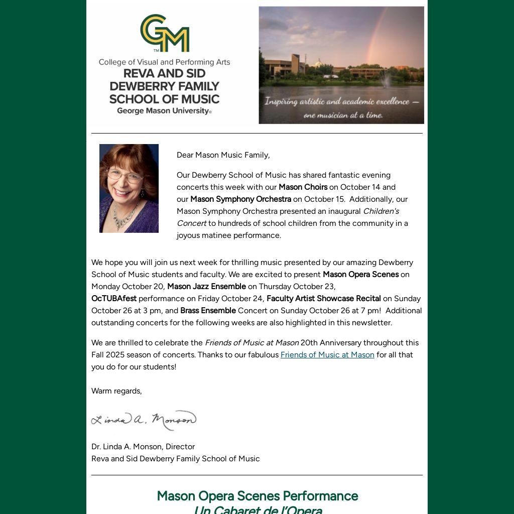 We hope you will join us next week for thrilling music presented by our amazing Dewberry School of Music students and faculty. We are excited to present Mason Opera Scenes on Monday October 20, Mason Jazz Ensemble on Thursday October 23, OcTUBAfest performance on Friday October 24, Faculty Artist Showcase Recital on Sunday October 26 at 3 pm, and Brass Ensemble Concert on Sunday October 26 at 7 pm! Additional outstanding concerts for the following weeks are also highlighted in this newsletter.