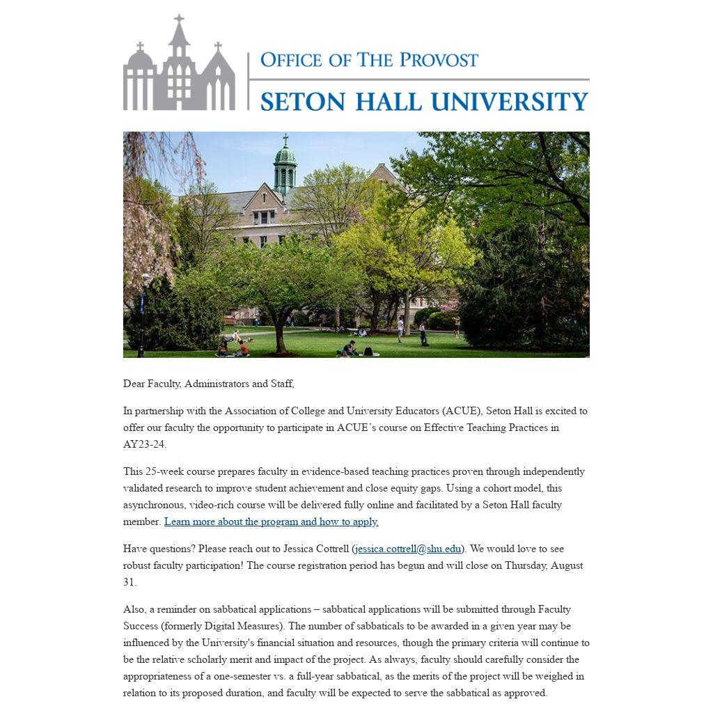 Have questions? Please reach out to Jessica Cottrell (jessica.cottrell@shu.edu). We would love to see robust faculty participation! The course registration period has begun and will close on Thursday, August 31.