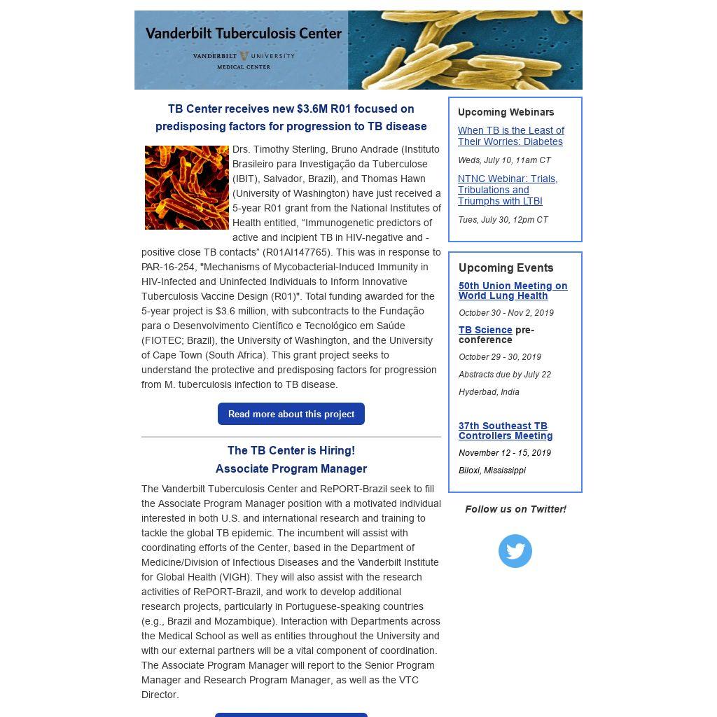 Drs. Timothy Sterling, Bruno Andrade (Instituto Brasileiro para Investigação da Tuberculose (IBIT), Salvador, Brazil), and Thomas Hawn (University of Washington) have just received a 5-year R01 grant from the National Institutes of Health entitled, “Immunogenetic predictors of active and incipient TB in HIV-negative and -positive close TB contacts” (R01AI147765). This was in response to PAR-16-254, "Mechanisms of Mycobacterial-Induced Immunity in HIV-Infected and Uninfected Individuals to Inform Innovative Tuberculosis Vaccine Design (R01)". Total funding awarded for the 5-year project is $3.6 million, with subcontracts to the Fundação para o Desenvolvimento Científico e Tecnológico em Saúde (FIOTEC; Brazil), the University of Washington, and the University of Cape Town (South Africa). This grant project seeks to understand the protective and predisposing factors for progression from M. tuberculosis infection to TB disease.