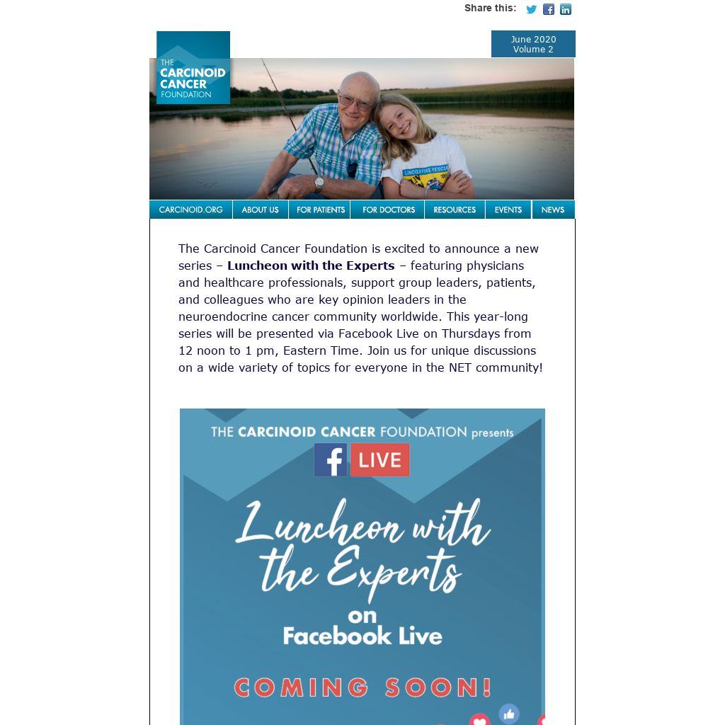 The Carcinoid Cancer Foundation is excited to announce a new series – Luncheon with the Experts – featuring physicians and healthcare professionals, support group leaders, patients, and colleagues who are key opinion leaders in the neuroendocrine cancer community worldwide. This year-long series will be presented via Facebook Live on Thursdays from 12 noon to 1 pm, Eastern Time. Join us for unique discussions on a wide variety of topics for everyone in the NET community!