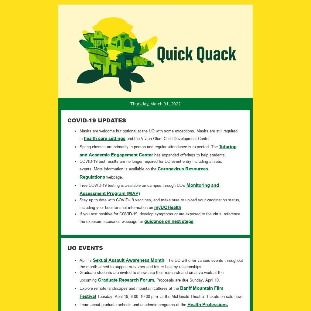Masks are welcome but optional at the UO with some exceptions. Masks are still required in health care settings and the Vivian Olum Child Development Center.