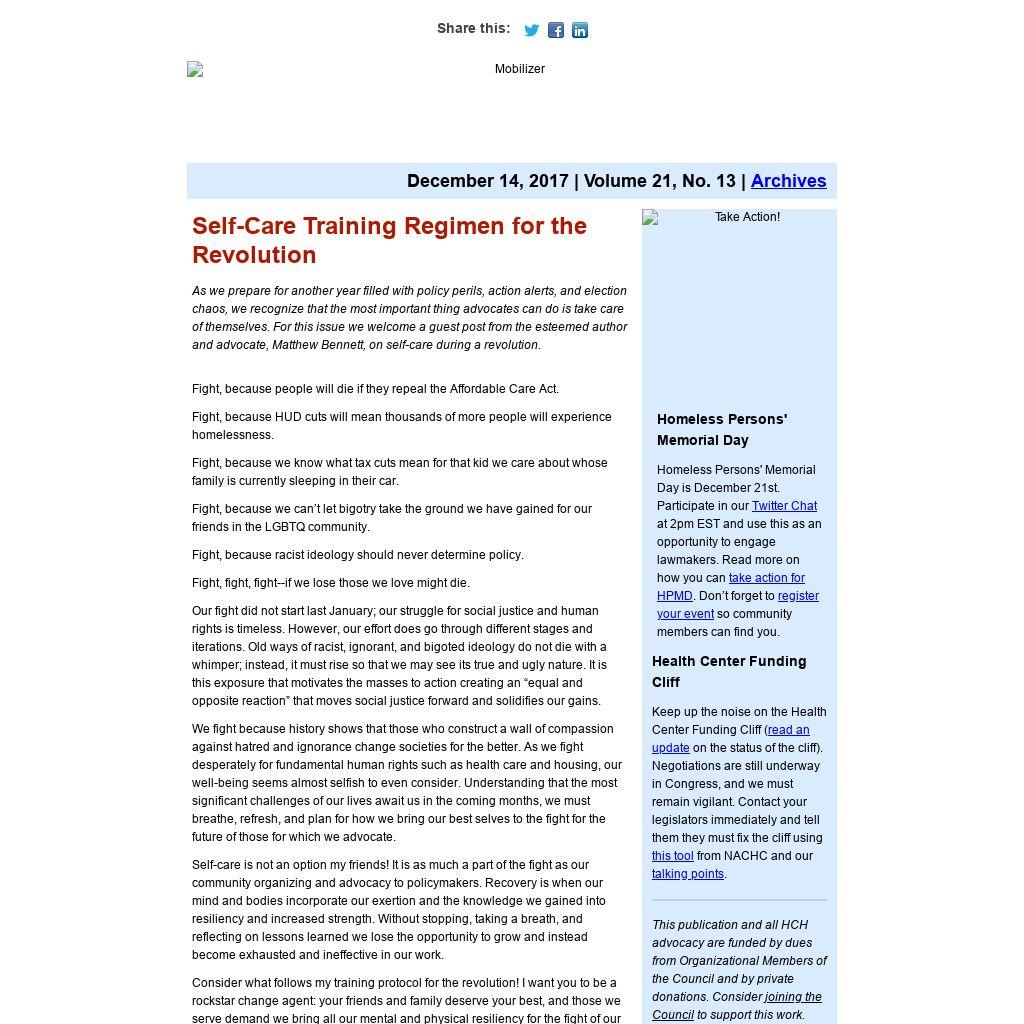 We fight because history shows that those who construct a wall of compassion against hatred and ignorance change societies for the better. As we fight desperately for fundamental human rights such as health care and housing, our well-being seems almost selfish to even consider. Understanding that the most significant challenges of our lives await us in the coming months, we must breathe, refresh, and plan for how we bring our best selves to the fight for the future of those for which we advocate.
