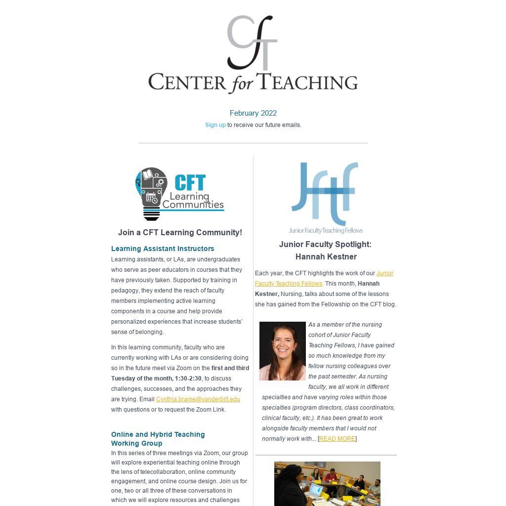 In this learning community, faculty who are currently working with LAs or are considering doing so in the future meet via Zoom on the first and third Tuesday of the month, 1:30-2:30, to discuss challenges, successes, and the approaches they are trying. Email Cynthia.brame@vanderbilt.edu with questions or to request the Zoom Link.