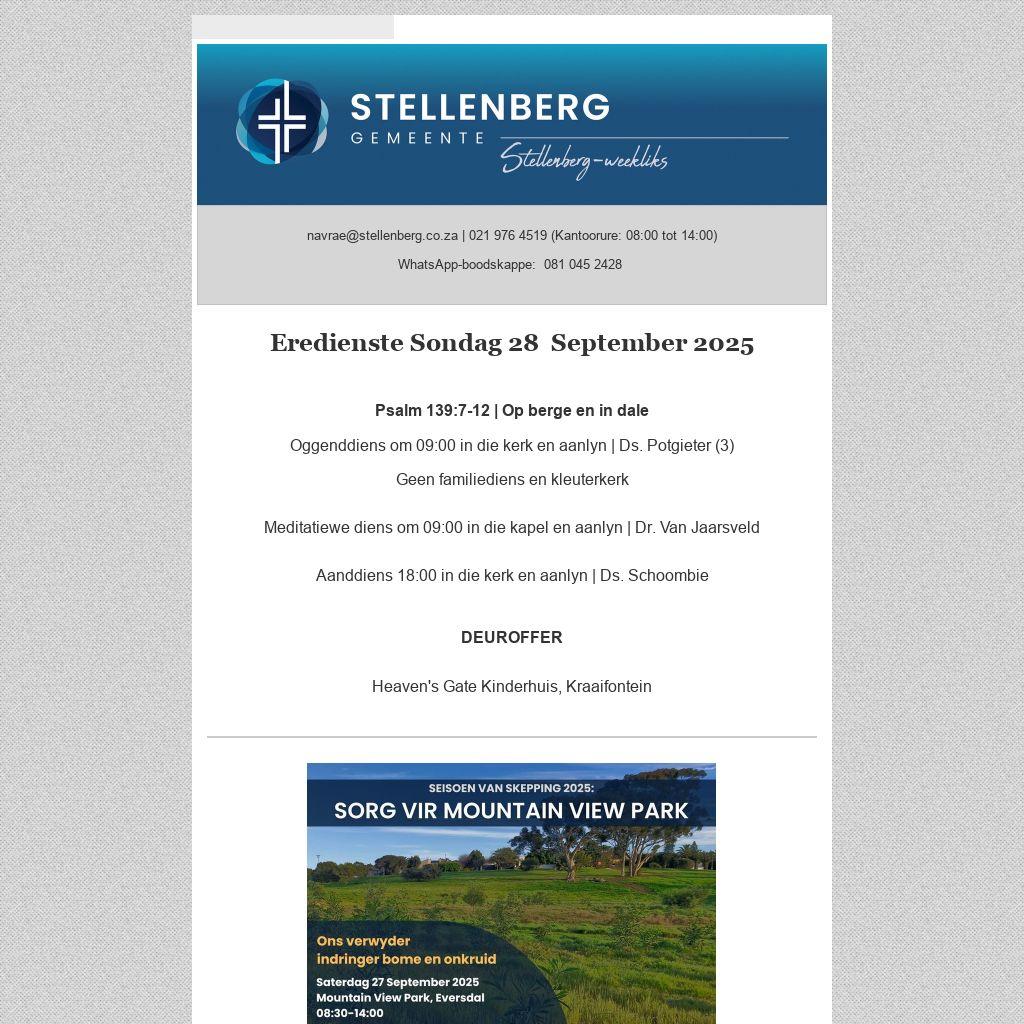 Plaas gerus ’n advertensie in die Stellenberg-weekliks. Die nuusblad word tans weekliks elektronies aan 2 500 persone gestuur en is ook op die gemeente se webwerf beskikbaar. Advertensies sal slegs aanlyn beskikbaar wees en word nie in gedrukte formaat uitgegee nie. Lees meer . . .