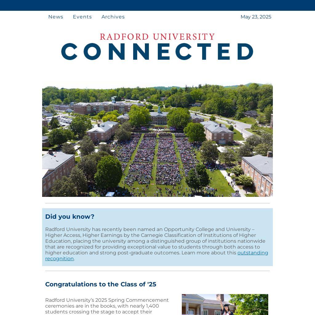 In the last issue of Radford University CONNECTED, we inadvertently included information about last year’s Spring Commencement ceremony in the “Did you know?” section. The correct fun facts about the 2025 ceremony are: