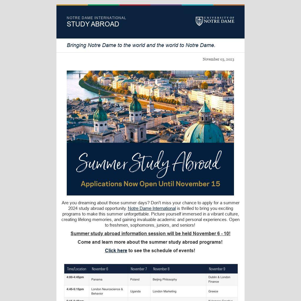 Are you dreaming about those summer days? Don't miss your chance to apply for a summer 2024 study abroad opportunity. Notre Dame International is thrilled to bring you exciting programs to make this summer unforgettable. Picture yourself immersed in a vibrant culture, creating lifelong memories, and gaining invaluable academic and personal experiences. Open to freshmen, sophomores, juniors, and seniors!
