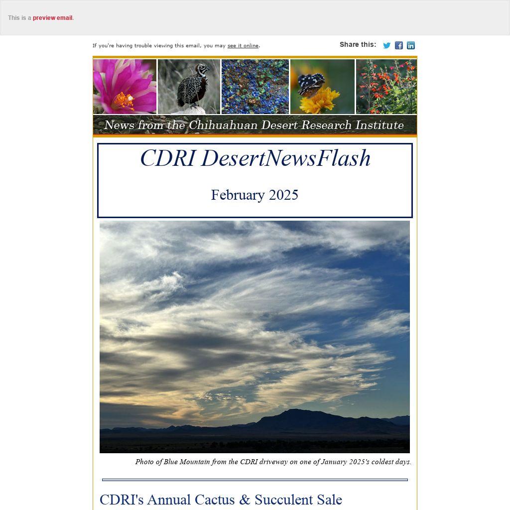 Join us for CDRI's Annual Cactus and Succulent Sale on opening day, Monday, March 10. The sale will begin at 9:00 a.m. and will continue until all plants are sold, with the best selection available on Monday morning.