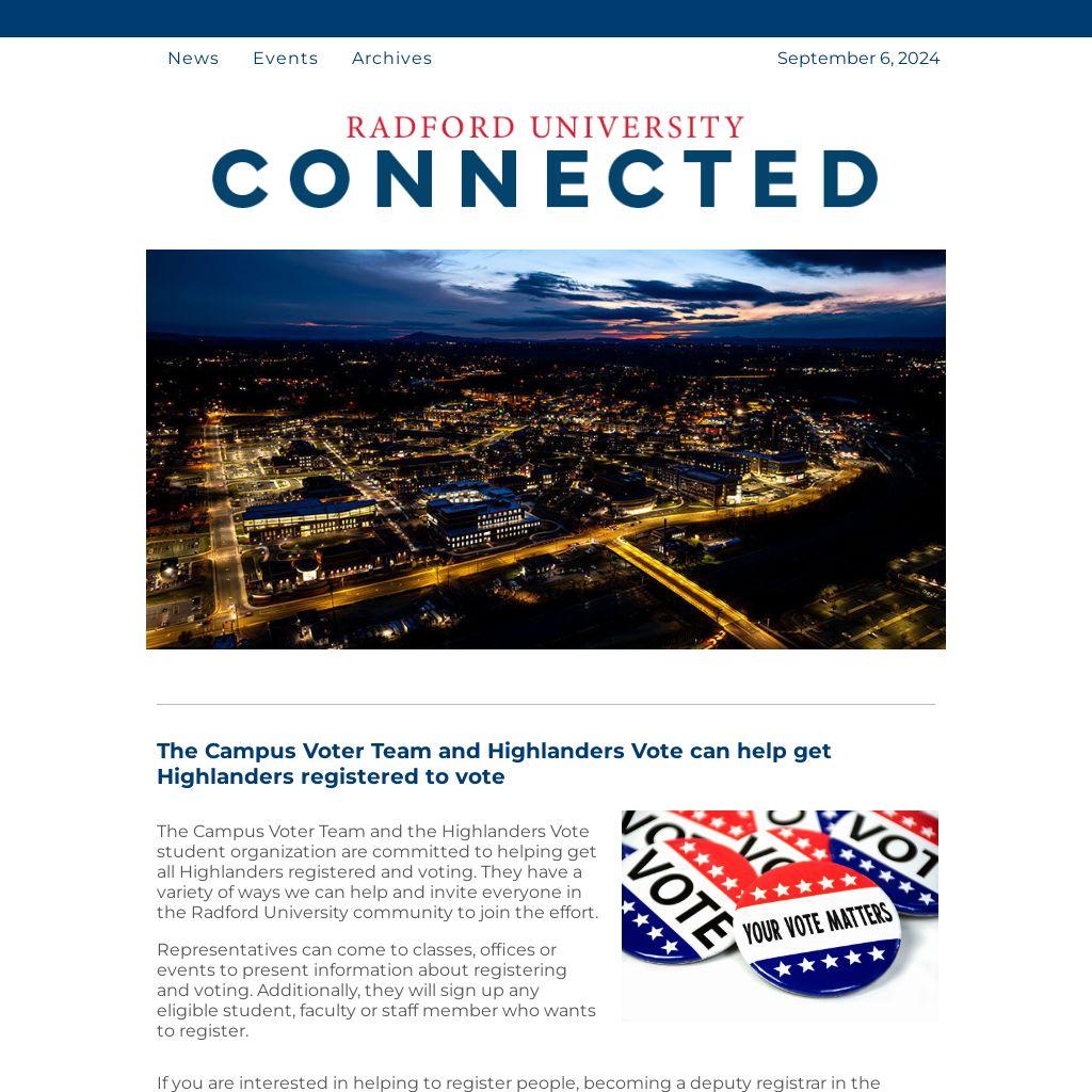 The Campus Voter Team and the Highlanders Vote student organization are committed to helping get all Highlanders registered and voting. They have a variety of ways we can help and invite everyone in the Radford University community to join the effort.