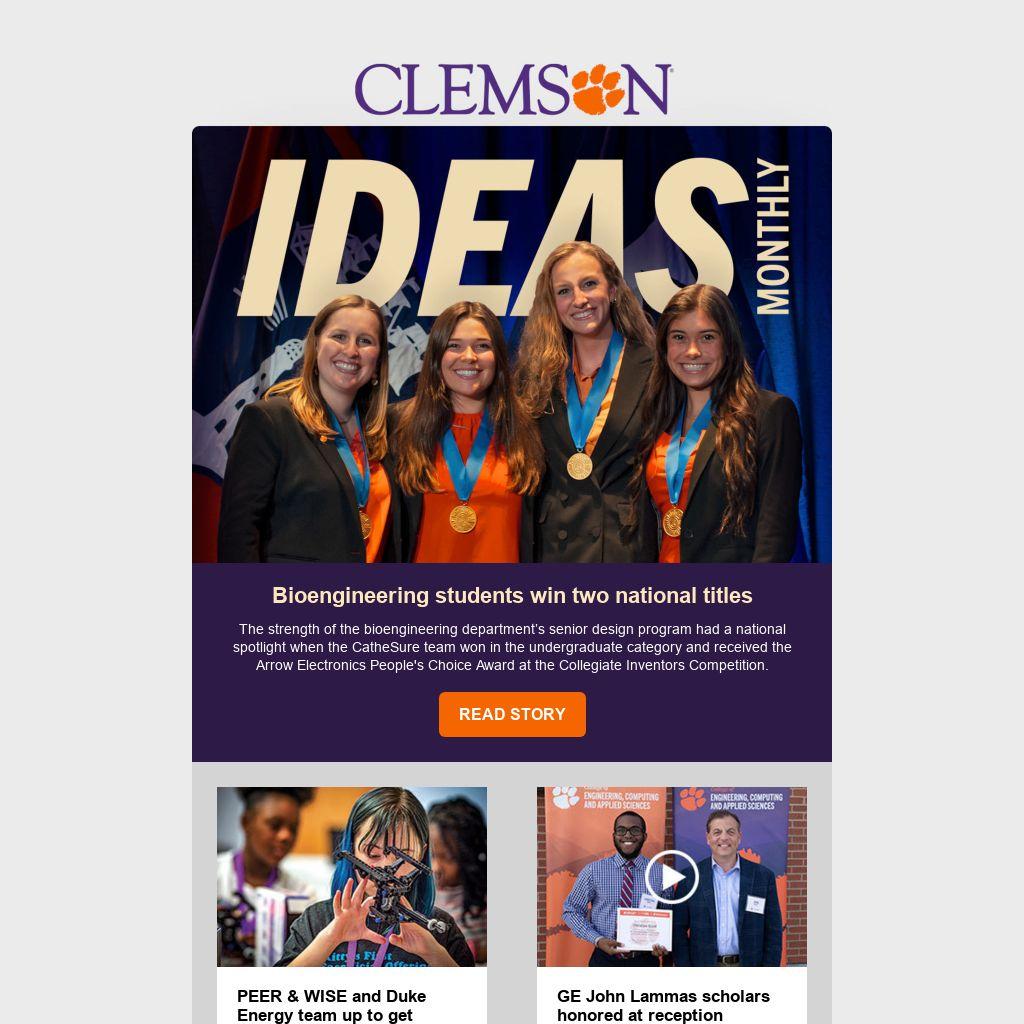 A team of bioengineers, all women, placed first in the undergraduate category at the Collegiate Inventors Competition in addition to winning the Arrow Electronics People’s Choice Award. And these are not their first honors; the team’s novel medical device, which began as their senior design project, has also earned several local and regional awards, including second place in the Atlantic Coast Conference InVenture Prize competition and first place in the PDMA Carolinas student innovation competition. We also highlight the collaboration between an interdisciplinary team of Clemson engineering and business students and a Washington State University-Everett team addressing the water quality on commercial airlines.