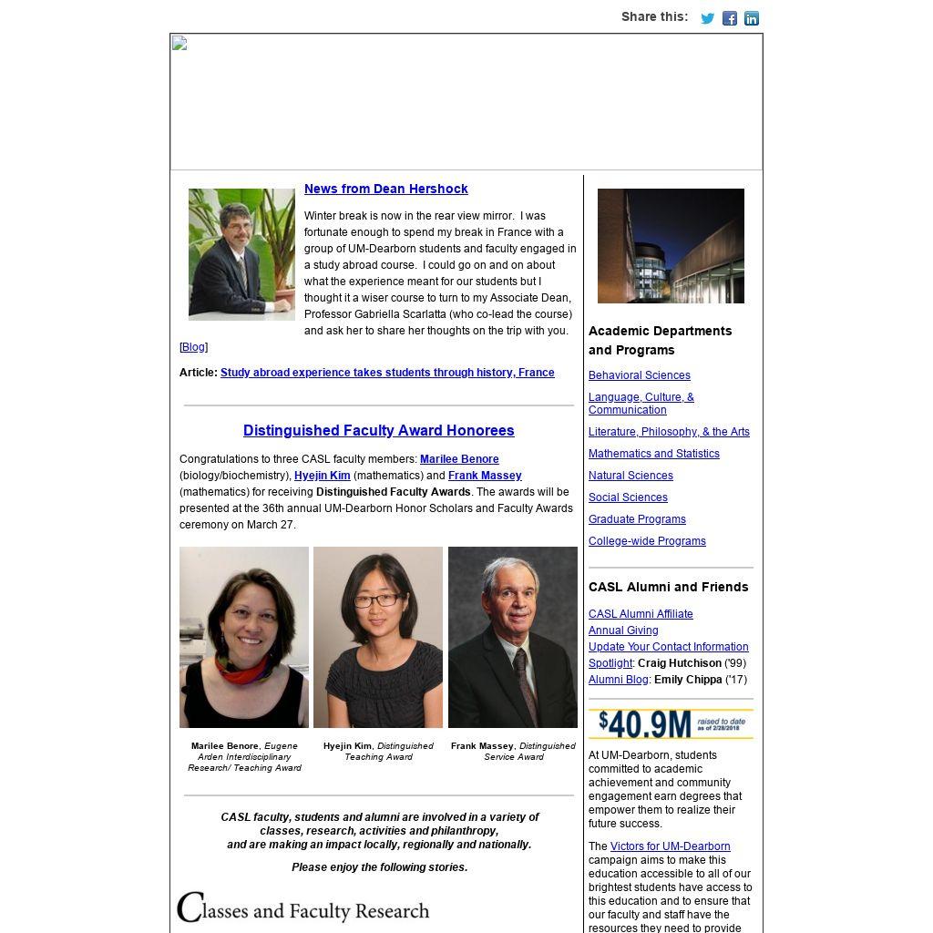 Congratulations to three CASL faculty members: Marilee Benore (biology/biochemistry), Hyejin Kim (mathematics) and Frank Massey (mathematics) for receiving Distinguished Faculty Awards. The awards will be presented at the 36th annual UM-Dearborn Honor Scholars and Faculty Awards ceremony on March 27.