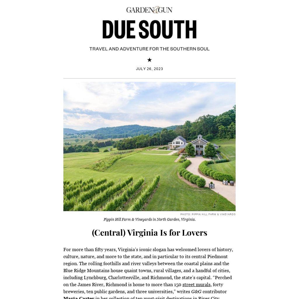 For more than fifty years, Virginia’s iconic slogan has welcomed lovers of history, culture, nature, and more to the state, and in particular to its central Piedmont region. The rolling foothills and river valleys between the coastal plains and the Blue Ridge Mountains house quaint towns, rural villages, and a handful of cities, including Lynchburg, Charlottesville, and Richmond, the state’s capital. “Perched on the James River, Richmond is home to more than 150 street murals, forty breweries, ten public gardens, and three universities,” writes G&G contributor Maria Carter in her collection of ten must-visit destinations in River City. Central Virginia is also the bucolic setting for three presidential homes, three prime kayaking rivers, and half of the state’s Civil War battlefield parks. To experience it like a local, take a dip in a hidden swimming hole, sip an award-winning vintage (with a stunning view), or swing by one of the nation’s oldest community markets.