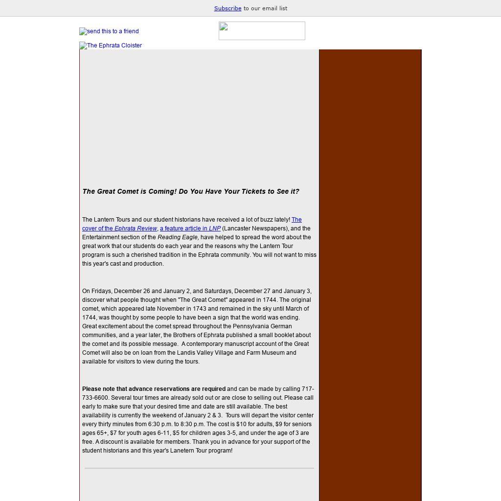 On Fridays, December 26 and January 2, and Saturdays, December 27 and January 3, discover what people thought when "The Great Comet" appeared in 1744. The original comet, which appeared late November in 1743 and remained in the sky until March of 1744, was thought by some people to have been a sign that the world was ending. Great excitement about the comet spread throughout the Pennsylvania German communities, and a year later, the Brothers of Ephrata published a small booklet about the comet and its possible message. A contemporary manuscript account of the Great Comet will also be on loan from the Landis Valley Village and Farm Museum and available for visitors to view during the tours.