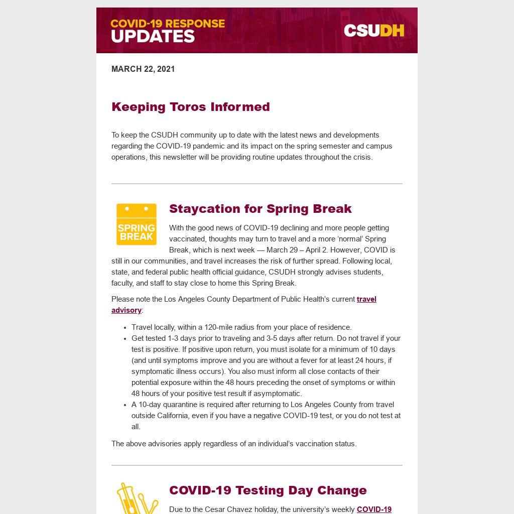 With the good news of COVID-19 declining and more people getting vaccinated, thoughts may turn to travel and a more ‘normal’ Spring Break, which is next week — March 29 – April 2. However, COVID is still in our communities, and travel increases the risk of further spread. Following local, state, and federal public health official guidance, CSUDH strongly advises students, faculty, and staff to stay close to home this Spring Break.
