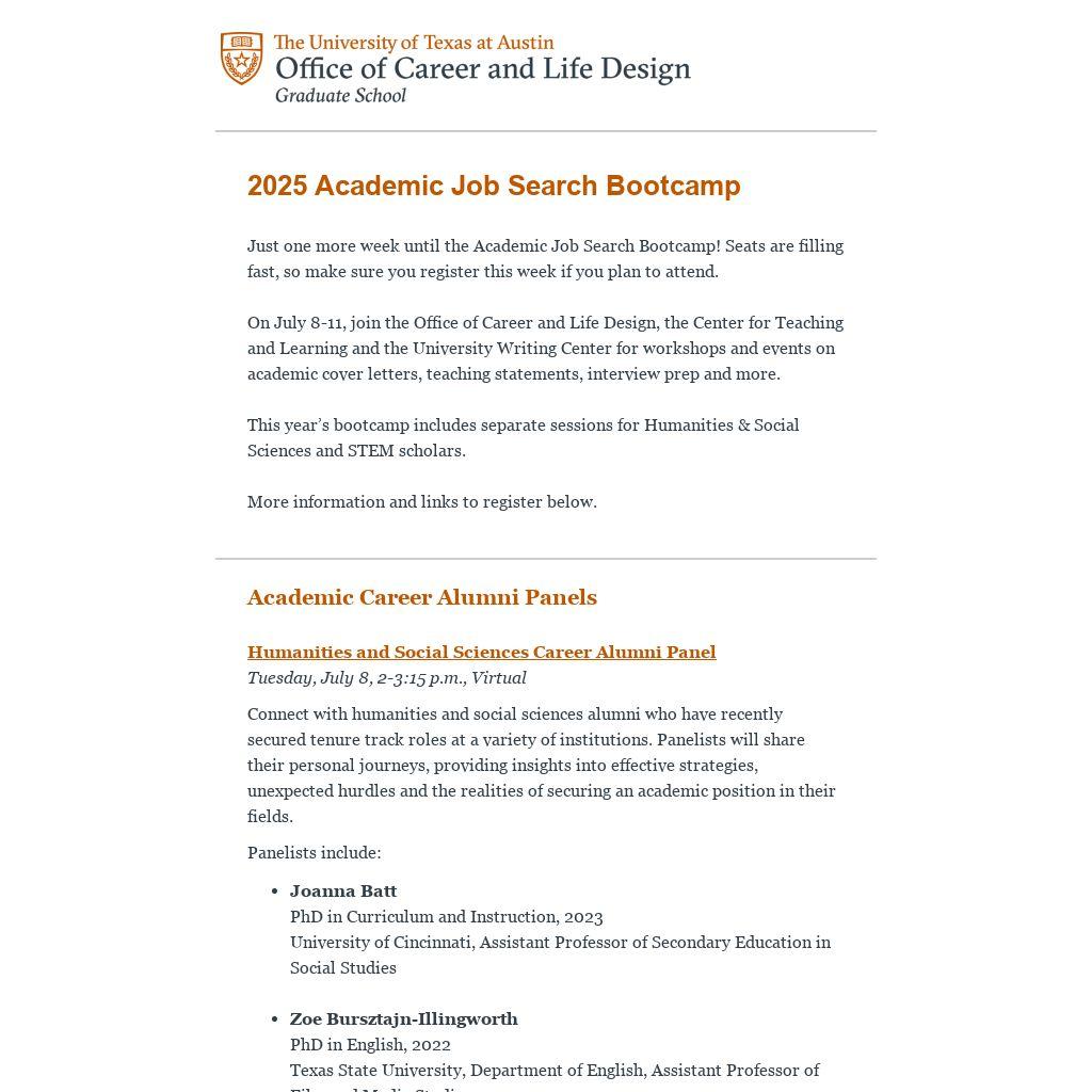 On July 8-11, join the Office of Career and Life Design, the Center for Teaching and Learning and the University Writing Center for workshops and events on academic cover letters, teaching statements, interview prep and more.