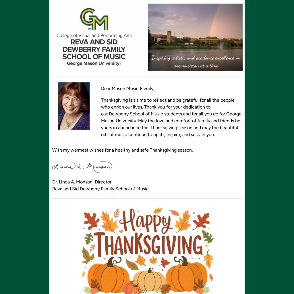 Thanksgiving is a time to reflect and be grateful for all the people who enrich our lives. Thank you for your dedication to our Dewberry School of Music students and for all you do for George Mason University. May the love and comfort of family and friends be yours in abundance this Thanksgiving season and may the beautiful gift of music continue to uplift, inspire, and sustain you.