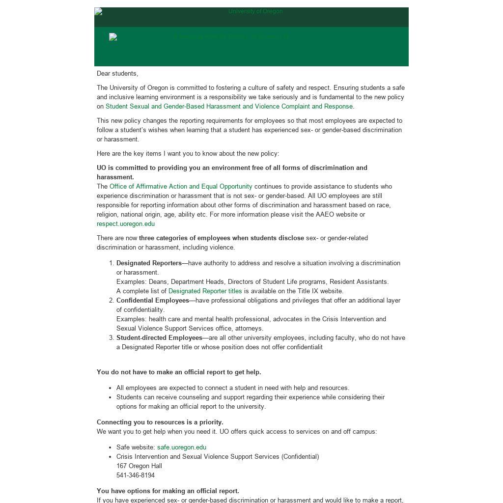 The University of Oregon is committed to providing a comprehensive and integrated response to students who have experienced any form of sexual harassment or discrimination. Our goal is to ensure that all students who report to the university are met with a caring and compassionate response, and are provided with access to all available resources necessary to continue their academic program.