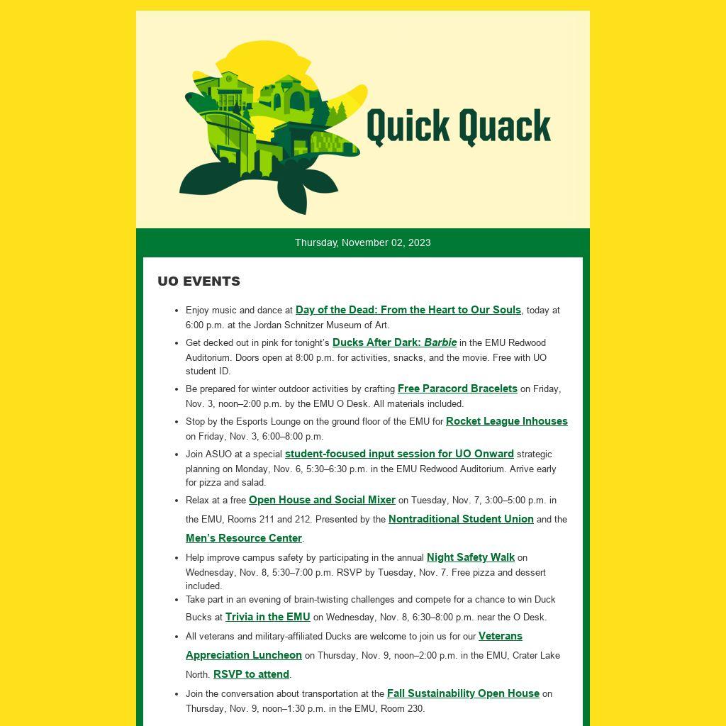 - Join ASUO at a special student-focused input session for UO Onward strategic planning on Monday, Nov. 6, 5:30–6:30 p.m. in the EMU Redwood Auditorium. Arrive early for pizza and salad.