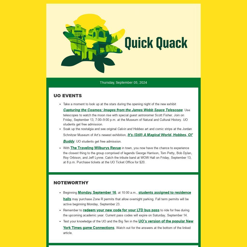 - Take a moment to look up at the stars during the opening night of the new exhibit Capturing the Cosmos: Images from the James Webb Space Telescope. Use telescopes to watch the moon rise with special guest astronomer Scott Fisher. Join on Friday, September 13, 7:00–9:00 p.m. at the Museum of Natural and Cultural History. UO students get free admission.