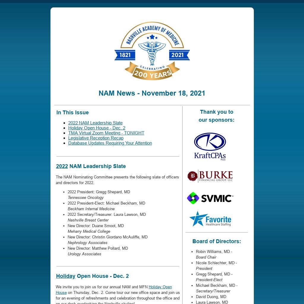 We have recently undergone a significant overhaul of our member database system that NAM and TMA share, converting to a new technology platform after 19 years. This upgrade will enhance our abilities to provide better member service and online access.