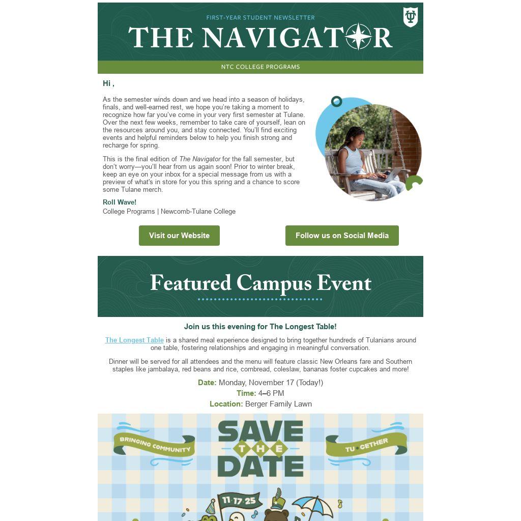 This is the final edition of The Navigator for the fall semester, but don’t worry—you’ll hear from us again soon! Prior to winter break, keep an eye on your inbox for a special message from us with a preview of what's in store for you this spring and a chance to score some Tulane merch.