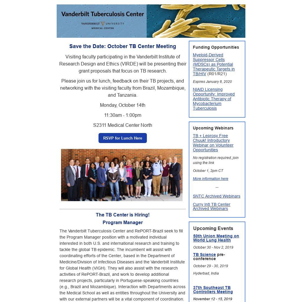 Visiting faculty participating in the Vanderbilt Institute of Research Design and Ethics (VIRDE) will be presenting their grant proposals that focus on TB research.
